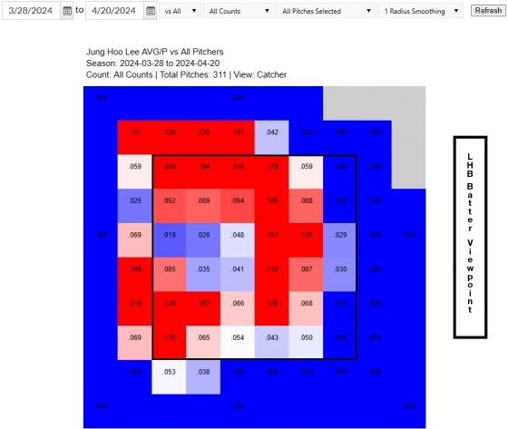 절정의 타격감은 타석에서의 몸쪽 공 대응 능력에서 빛났다. 마지막 타석이었던 8회 말 1사 2루에서 이정후는 미겔 카스트로를 상대했다. 카스트로는 슬라이더, 체인지업, 싱커 등 다양한 구종으로 이정후의 몸쪽을 집요하게 노리며 압박했다. 뛰어난 선구안과 콘택트 기술을 가진 이정후가 그나마 약점을 보이는 곳이 몸쪽 공이기 때문. 이정후는 스트라이크 존 안에 들어오는 공은 90.2%의 높은 확률(리그 평균 82%)로 콘택트하는 건 물론이고 헛스윙은 극도로 하지 않아(11.8%, 리그 평균 24.8%) 까다로운 타자로 여겨진다.