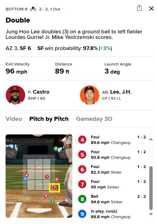 이날도 이정후는 2S1B의 불리한 볼 카운트에서 무려 4개의 파울타구를 만들어 카스트로를 어렵게 했다. 그중 백미는 7구째 시속 95마일 싱커였다. 이정후는 몸쪽 낮게 들어오는 싱커를 뒤로 훌쩍 몸을 움직이면서 기술적으로 타구를 만들었다. 비록 파울 라인 바깥으로 넘어가 안타가 되지 않았으나, 카스트로가 바깥쪽 승부를 겨루게 만들었다. 결국 9구째 체인지업을 잘 밀어 쳐 좌익선상으로 향하는 1타점 적시 2루타로 시즌 8번째 멀티히트에 성공했다.