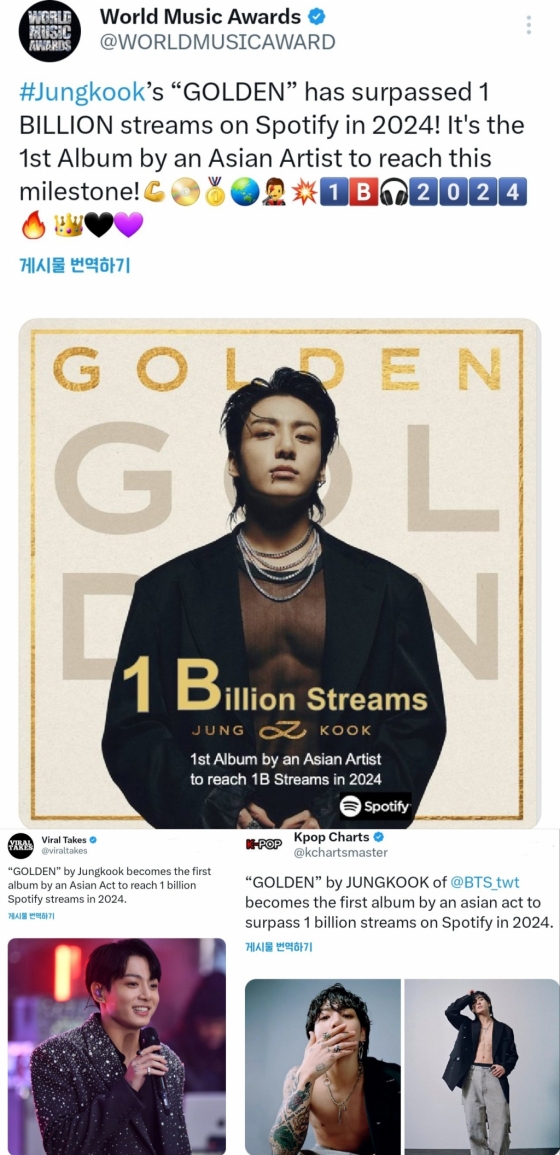 방탄소년단(BTS) 정국의 'GOLDEN'(골든)이 2024년 아시아 아티스트 앨범 최초로 10억 스트리밍 대기록을 달성했다.