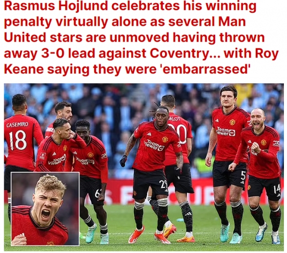 영국 매체 '데일리 메일'은 22일(한국시간) "맨유 공격수 라스무스 호일룬(21)은 경기가 끝난 뒤 홀로 승부차기 승리를 축하했다. 안토니(23)는 상대 팀 팬들에게 귀를 쫑긋 세우는 세리머니를 했다"라며 "경기를 본 맨유의 전설적인 미드필더 로이 킨(53)은 '부끄럽다'라고 말했다. 축구 전문가 클린턴 모리슨은 안토니의 행동을 비판했다"라고 집중 조명했다.