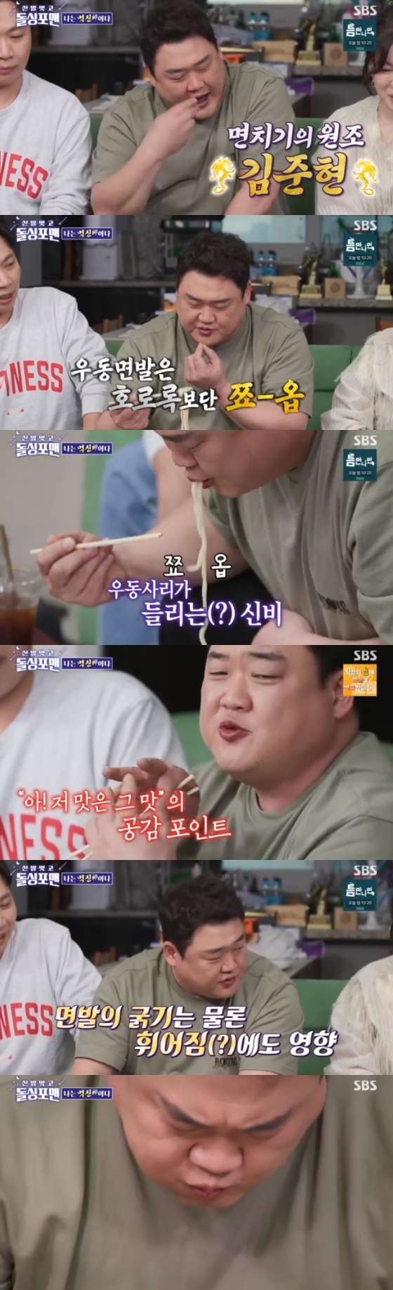 '돌싱포맨'에 출연한 개그맨 김준현이 면치기 먹방의 노하우를 아낌없이 전수했다.