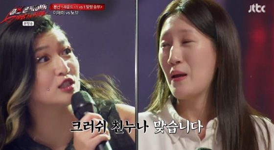 이채미와 대결을 겨루게 된 도전자는 노브였다. 부끄러운 듯한 표정과 말투로 조심스럽게 입을 연 그녀는 "가수 크러쉬의 친 누나다"라고 자신을 소개했다. 모두가 놀란 표정을 감추지 못한 가운데 노브는 "동생한테 말했더니 무조건 나가서 1등 하고 오라고 하더라"라고 말했다.