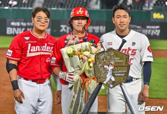 타구가 관중석에 꽂힌 걸 확인한 최정은 덤덤히 그라운드를 돌았다. 이숭용 SSG 감독이 준비한 꽃목걸이를 목에 건 최정은 이어 더그아웃 밖에서 도열한 SSG 동료들과 하이파이브를 이어가며 기쁨을 나눴다. 이후 양 팀 주장 추신수(SSG)와 전준우(롯데)에게 꽃다발을 받은 그는 함박미소를 지으며 인사했다. 최정은 팀이 준비한 트로피 앞에서 기념촬영을 한 후 더그아웃으로 돌아갔다.