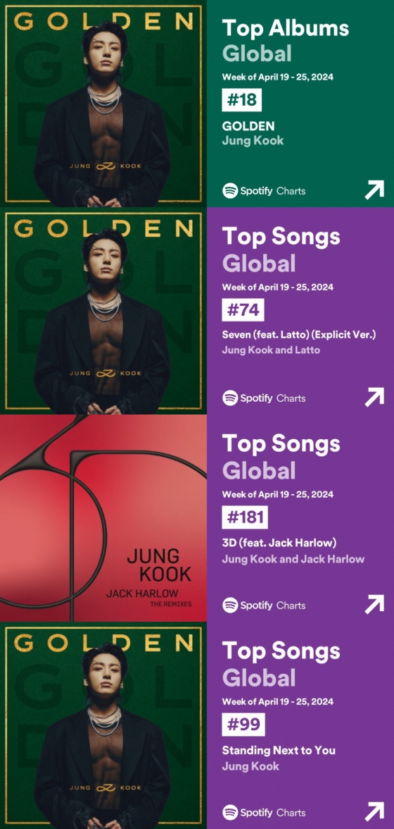 스포티파이 '위클리 톱 송 글로벌' 차트(4월 19일~25일)에서는 정국의 솔로 싱글 'Seven'(세븐)이 74위, '3D' 181위, 'GOLDEN' 앨범 타이틀곡 'Standing Next to You'(스탠딩 넥스트 투 유) 99위로 총 3곡이나 랭크됐고, 각각 41주, 30주, 25주째 장기 진입했다.