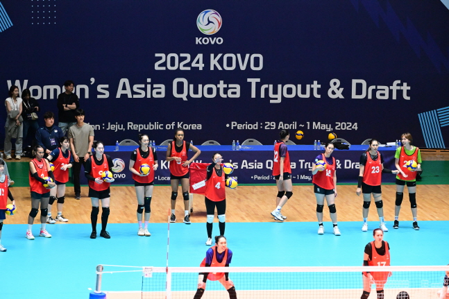 2024 KOVO 여자부 아시아쿼터 트라이아웃은 29일부터 제주 한라체육관 및 썬호텔에서 진행 중이다. 29일 신체 측정과 연습경기, 이날 인터뷰와 메디컬 테스트, 연습 경기를 펼쳤다. 아시아쿼터 규정으로 원소속이 재계약을 원할 경우 구단에 우선지명권이 부여되고 드래프트 전날(4월 30일 오후 6시)까지 연맹에 계약서를 제출해야 하는데 정관장과 현대건설은 기존 선수들과 동행을 결정했다.