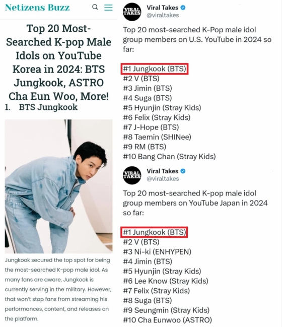 해외 매체 '바이럴 테이크스'(Viral Takes), '네티즌 버즈'(Netizens buzz)에 따르면, 정국은 2024년 한국, 미국, 일본 유튜브에서 가장 많이 검색된 남자 아이돌 1위로 나타났다.
