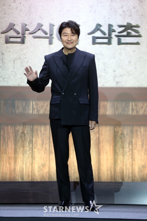 배우 송강호가 8일 오전 서울 강남구 그랜드인터콘티넨탈 파르나스 그랜드 볼룸에서 열린 디즈니+ 드라마 '삼식이 삼촌' 제작발표회에 참석해 포즈를 취하고 있다.