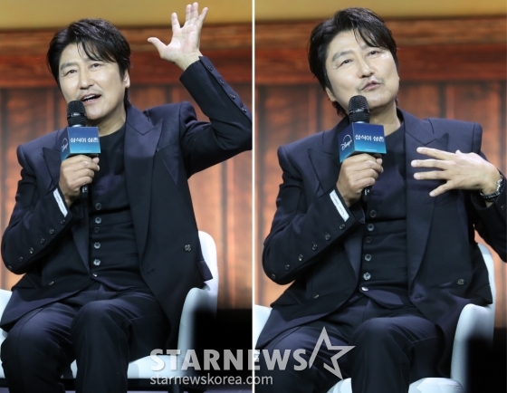 배우 송강호가 8일 오전 서울 강남구 그랜드인터콘티넨탈 파르나스 그랜드 볼룸에서 열린 디즈니+ 드라마 '삼식이 삼촌' 제작발표회에 참석해 작품에 대한 설명을 하고 있다.