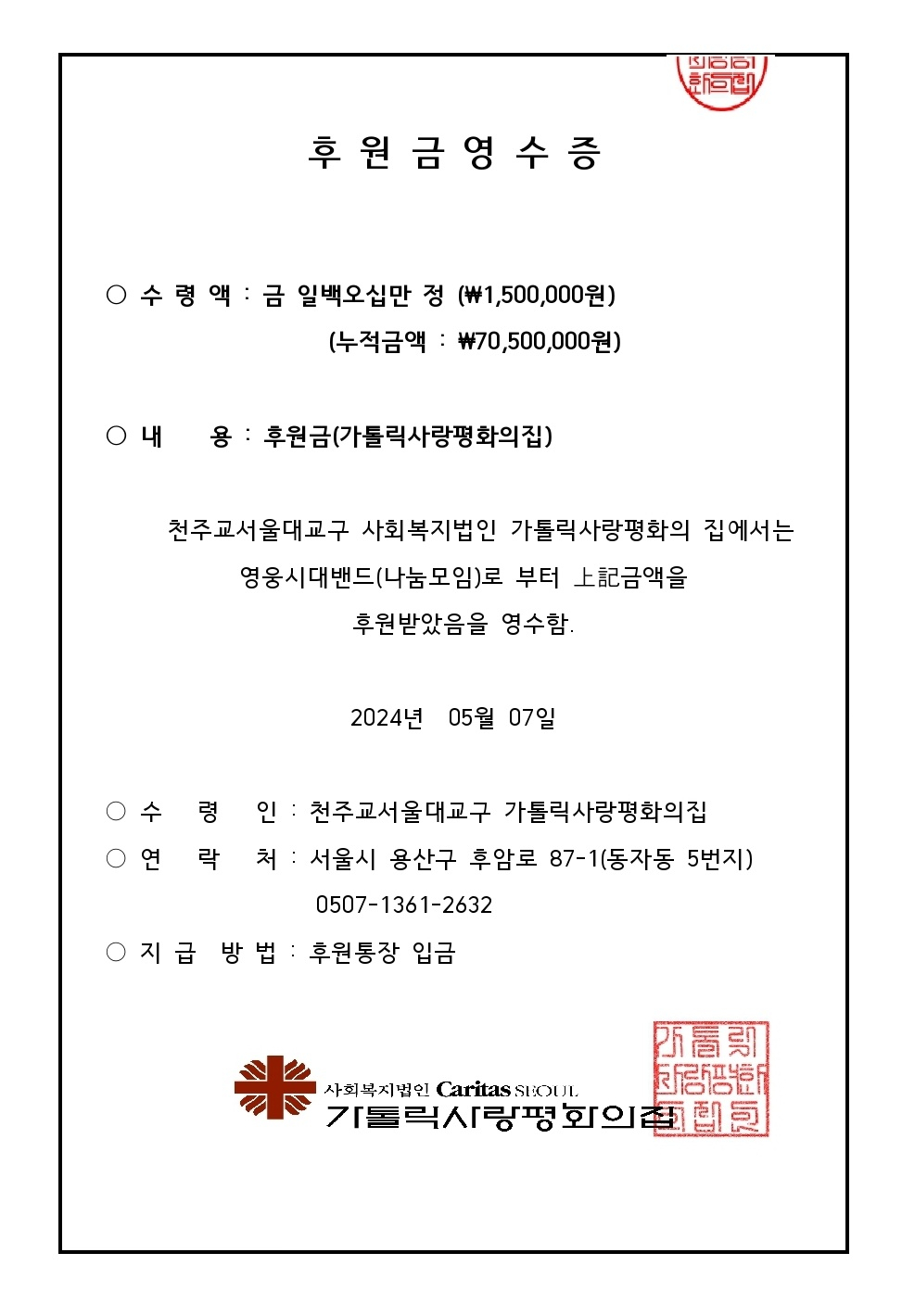 임영웅 팬클럽 영웅시대밴드(나눔모임)은 5월 7일 서울 용산구 동자동 천주교서울대교구 가톨릭사랑평화의집에서 63번째 도시락 봉사를 했다.