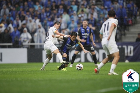 비가 점점 거세진 가운데 인천의 세트피스가 번뜩였다. 전반 35분 프리킥 상황에서 델브리지가 크로스를 향해 몸을 날렸다. 발에 정확히는 맞지 못했다. 공이 골대 옆으로 벗어났다. 하지만 전반 36분 인천의 선제골이 터졌다. 세트피스였다. 이번에는 코너킥 찬스에서 최우진이 정확한 크로스를 올렸고, 멀리 돌아 뛰던 무고사가 정확한 슈팅으로 연결해 골망을 흔들었다.