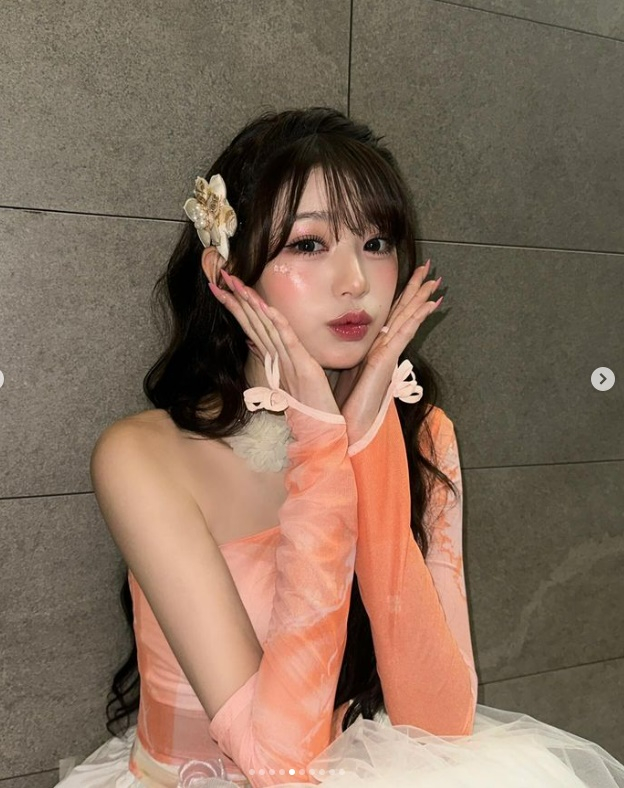 사진 속 장원영은 신곡 '해야'의 무대의상을 입고 다양한 포즈를 취하고 있었다.