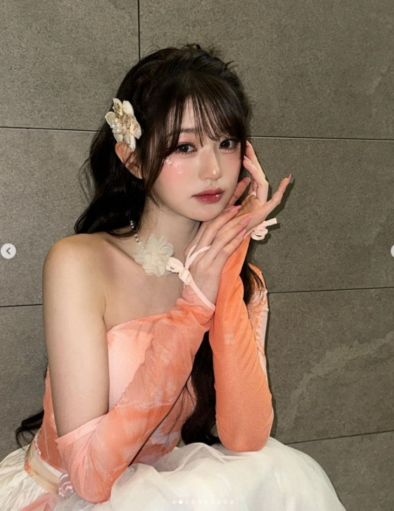 사진 속 장원영은 신곡 '해야'의 무대의상을 입고 다양한 포즈를 취하고 있었다.