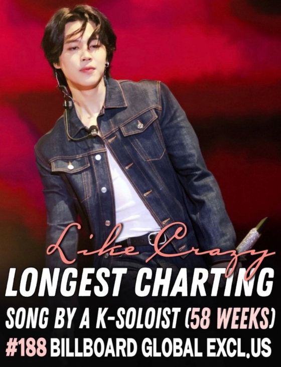 타이틀곡 '라이크 크레이지'는 빌보드 글로벌 차트(BILLBOARD GLOBAL Excl. US) 188위에 올라 58주간 연속 순위권에 머무르며 지난주에 이어 K팝 솔로곡 최장기 차트인 기록을 거듭 세우고 있다.