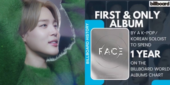 지난 7일 미국 음악 전문 매체 빌보드 최신 차트(5월 11일 자)에 따르면 지민의 '페이스'는 빌보드 '월드 앨범 차트'(World Album Chart) 14위에 올랐다. 'FACE'는 52주간 차트인하며 K팝 솔로 앨범 최초 동차트에서 1년을 기록한 최초이자 유일한 앨범이 됐다.