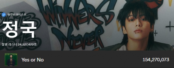정국이 지난해 11월 발매한 첫 솔로 앨범 'GOLDEN'(골든) 수록곡 'Yes or No'는 최근 세계 최대 음원 스트리밍 플랫폼 스포티파이에서 1억 5000만 스트리밍을 돌파했다.