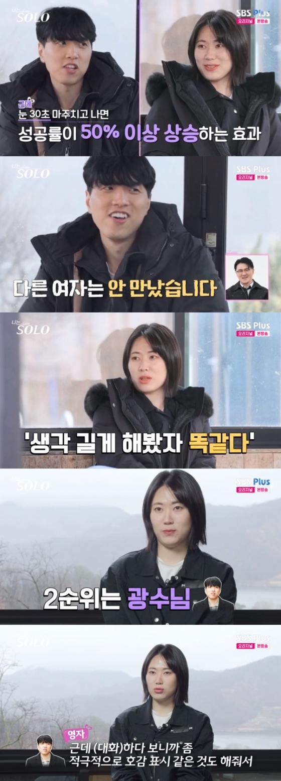 이날 방송에서 광수는 "영자 님과 현숙 님 중에 고민이 된다"라면서 영자에게 대화를 신청했다. 그는 영자의 눈을 뚫어져라 쳐다보며 "눈을 마주치는 게 힘들면 한쪽 눈만 바라보면 된다. 눈을 잘 마주치면 연애 확률이 높아진다"라고 말했다.
