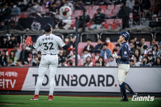 당시 5타수 3안타(2홈런) 3타점 2득점의 맹활약을 펼친 황성빈을 쿠에바스가 모를 리 없었다. 그리고 이날 다시 둘이 마주했다. 황성빈은 1회 선두타자로 나선 첫 타석부터 쿠에바스를 괴롭혔다. 초구 파울 이후 2구째는 헛스윙. 순식간에 불리한 0-2의 볼카운트에 몰렸지만, 황성빈은 집중력을 잃지 않았다. 결국 3구와 4구, 5구, 그리고 6구째 연속으로 볼 4개를 골라내며 출루에 성공했다.