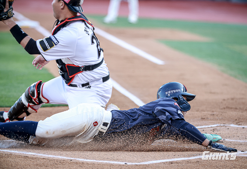 빠른 발을 갖춘 황성빈의 출루에 쿠에바스와 장성우 배터리는 물론, KT 내야진 전체가 피곤할 수밖에 없었다. 아니나 다를까, 쿠에바스의 1루 견제구가 뒤로 빠지는 틈을 타 황성빈은 2루에 안착했다. 공식 기록은 쿠에바스의 견제 송구 실책. 쿠에바스는 계속해서 흔들렸다. 2번 고승민을 좌익수 뜬공으로 처리했으나, 3번 레이예스 타석 때 폭투를 범하며 황성빈의 3루 진루를 허용한 것. 쿠에바스는 레이예스를 중견수 뜬공으로 유도했다. 그런데 홈으로 들어오기에는 거리가 다소 짧은 듯했다. 하지만 황성빈은 특유의 이를 악물고 뛰는 주루 플레이를 펼치며 득점에 성공했다. 황성빈이 홈 플레이트를 쓸어 버리면서 팀에 귀중한 선제 득점을 안긴 순간이었다.