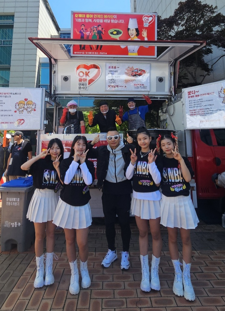 노현태는 16일 서울 성동구청 야외 앞마당에서 키즈 치어리딩 걸그룹 에코엔젤스, 오케이좋아 연예인봉사단 등과 함께 어르신 500여명에게 짜장밥차 나눔 봉사 행사를 했다.