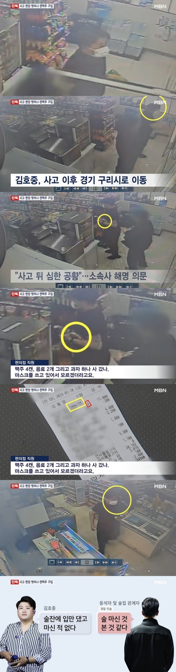이는 소속사가 김호중이 사고 직후 공황증세를 보여 제대로 수습하지 못했던 것 같다고 입장을 밝힌 것과는 상반된 정황으로 또 논란을 부른다. 편의점 직원은 "맥주 4캔, 음료 2개 그리고 과자 하나 사 갔나. 마스크를 쓰고 있어서 모르겠더라"고 말했다.