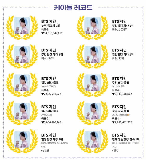 지민은 이로써 163주 우승의 신기록을 썼다. 지민은 '일일랭킹 최장 1위' 부문에서 1위부터 5위까지 모두 자신의 이름을 올린 것은 물론 5월 15일 기준 4일 연속 1위를 거머쥐며 '일일랭킹 최다 1위' 부문 1058회의 전무후무한 기록을 세웠다.