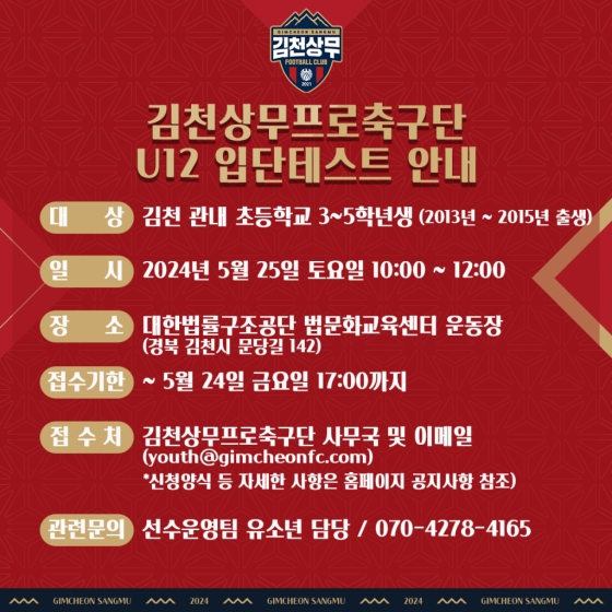 한편, 김천상무 U12 입단테스트 관련 사항은 선수운영팀(070-4278-4165)으로 전화 문의할 수 있다.
