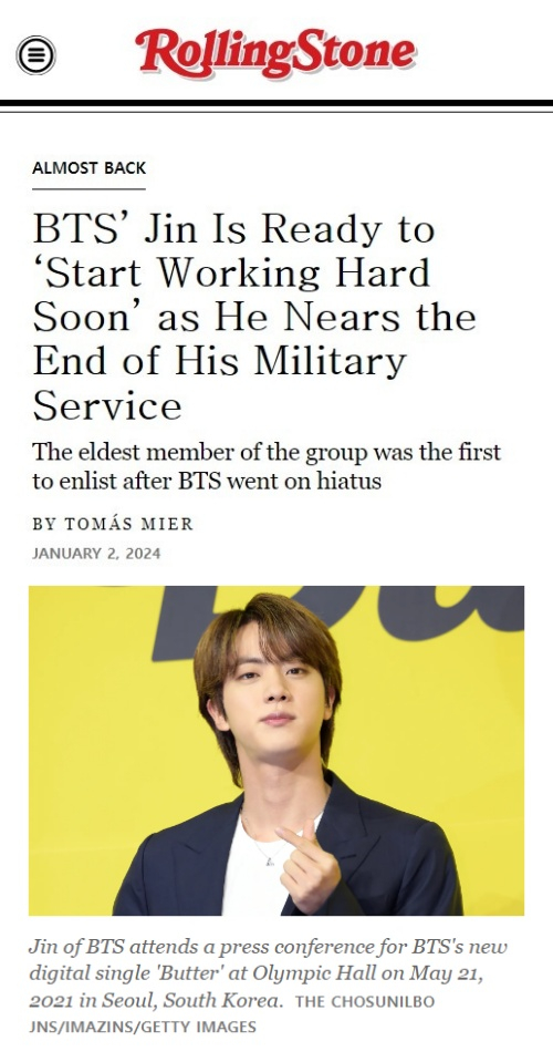 미국의 음악 전문 매체 롤링스톤(Rolling Stone)은 기사에서 '군 전역이 임박한 방탄소년단 진'이란 제목으로 진이 다시 활동을 재개하는 모습을 보게 될 날도 머지않았다고 전했다.
