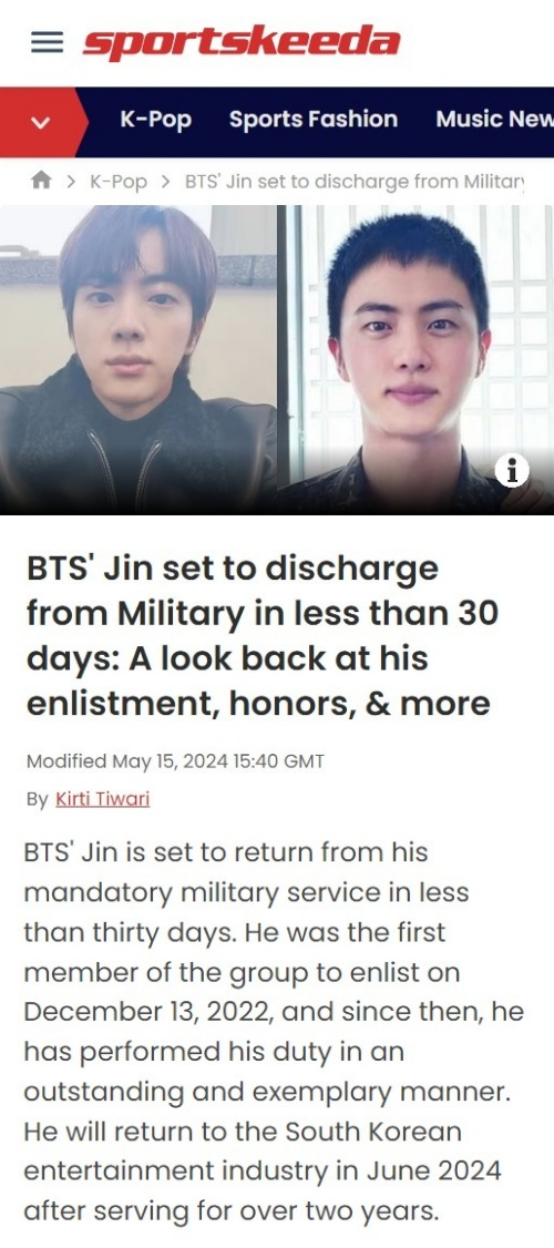 미국의 글로벌 연애 매체 'SKPOP'도 진에 대해 전했다. 매체는 '전역 30일 미만을 앞둔 방탄소년단 진: 입대부터 그가 일구어낸 수많은 성과를 되돌아보며'라는 타이틀의 기사에서 군 복무를 훌륭하게 수행하고 있는 진의 업적에 대해 나열했다.