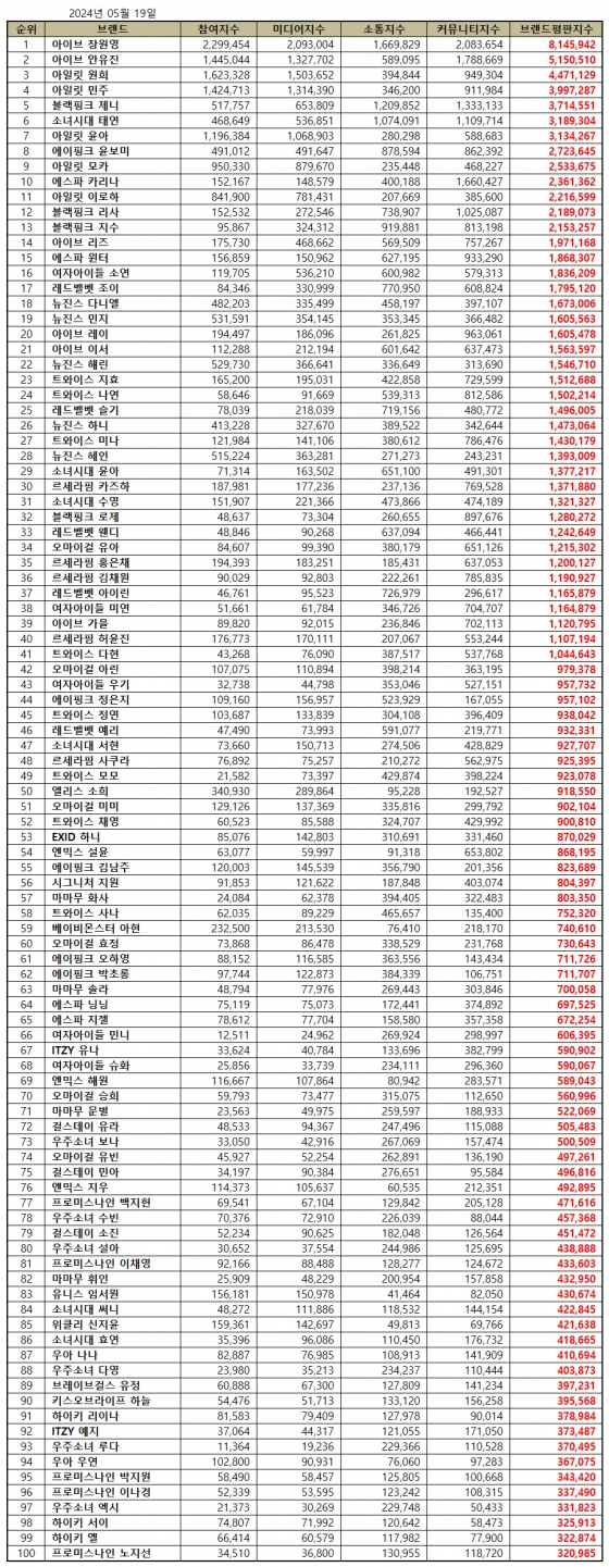 2024년 5월 걸그룹 개인 브랜드평판 100위 브랜드는 아이브 장원영, 아이브 안유진, 아일릿 원희, 아일릿 민주, 블랙핑크 제니, 소녀시대 태연, 아일릿 윤아, 에이핑크 윤보미, 아일릿 모카, 에스파 카리나, 아일릿 이로하, 블랙핑크 리사, 블랙핑크 지수, 아이브 리즈, 에스파 윈터, 여자아이들 소연, 레드벨벳 조이, 뉴진스 다니엘, 뉴진스 민지, 아이브 레이, 아이브 이서, 뉴진스 해린, 트와이스 지효, 트와이스 나연, 레드벨벳 슬기, 뉴진스 하니, 트와이스 미나, 뉴진스 혜인, 소녀시대 윤아, 르세라핌 카즈하, 소녀시대 수영, 블랙핑크 로제, 레드벨벳 웬디, 오마이걸 유아, 르세라핌 홍은채, 르세라핌 김채원, 레드벨벳 아이린, 여자아이들 미연, 아이브 가을, 르세라핌 허윤진, 트와이스 다현, 오마이걸 아린, 여자아이들 우기, 에이핑크 정은지, 트와이스 정연, 레드벨벳 예리, 소녀시대 서현, 르세라핌 사쿠라, 트와이스 모모, 엘리스 소희, 오마이걸 미미, 트와이스 채영, EXID 하니, 엔믹스 설윤, 에이핑크 김남주, 시그니처 지원, 마마무 화사, 트와이스 사나, 베이비몬스터 아현, 오마이걸 효정, 에이핑크 오하영, 에이핑크 박초롱, 마마무 솔라, 에스파 닝닝, 에스파 지젤, 여자아이들 민니, ITZY 유나, 여자아이들 슈화, 엔믹스 해원, 오마이걸 승희, 마마무 문별, 걸스데이 유라, 우주소녀 보나, 오마이걸 유빈, 걸스데이 민아, 엔믹스 지우, 프로미스나인 백지헌, 우주소녀 수빈, 걸스데이 소진, 우주소녀 설아, 프로미스나인 이채영, 마마무 휘인, 유니스 임서원, 소녀시대 써니, 위클리 신지윤, 소녀시대 효연, 우아 나나, 우주소녀 다영, 브레이브걸스 유정, 키스오브라이프 하늘, 하이키 리이나, ITZY 예지, 우주소녀 루다, 우아 우연, 프로미스나인 박지원, 프로미스나인 이나경, 우주소녀 엑시, 하이키 서이, 하이키 옐, 프로미스나인 노지선 순으로 분석됐다.