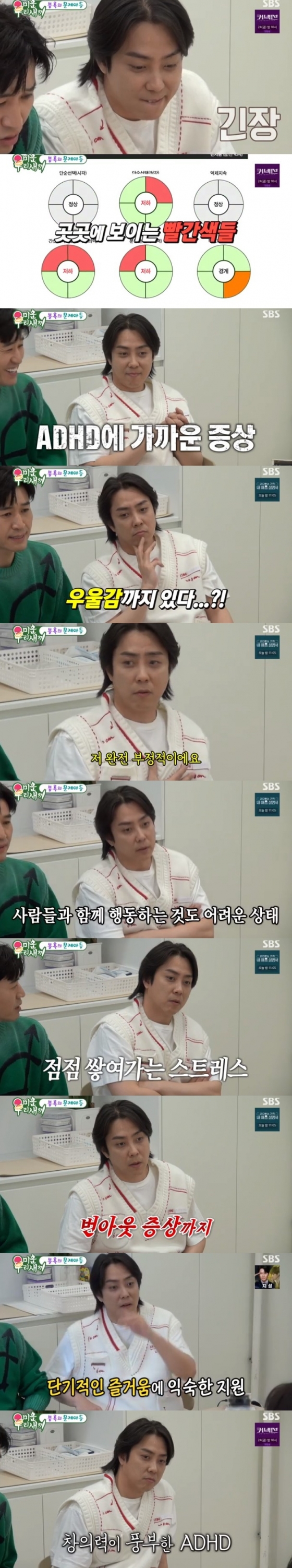 이같은 은지원의 질문에 상담사는 "단기적인 보상에 익숙할 거다. 게임 같은 건 여러 가지 자극이 있다. 단기적인 자극을 주는 것에 집중하는 경향이 있을 것이다"라면서도 "ADHD가 장점도 있다. 창의력이 높다. 오늘 자신을 정확하게 알았으니까 이제부터 노력하면 된다"라고 조언했다.