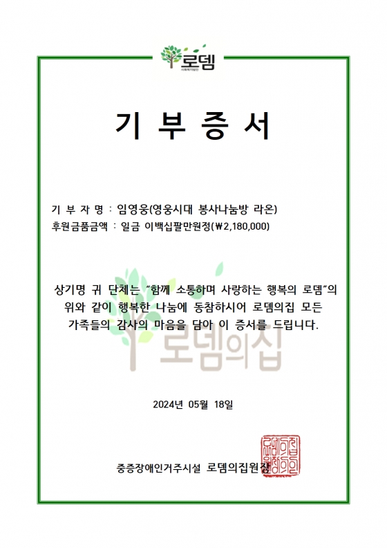 로뎀의집 이정순 원장은 "임영웅님과 선한 영향력으로 사랑과 나눔을 실천하는 영웅님의 팬들이 이 시대의 진정한 영웅이라고 생각되며 진심으로 감사드린다"고 전했다.