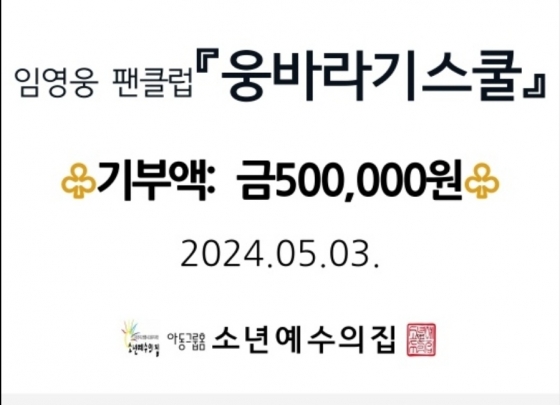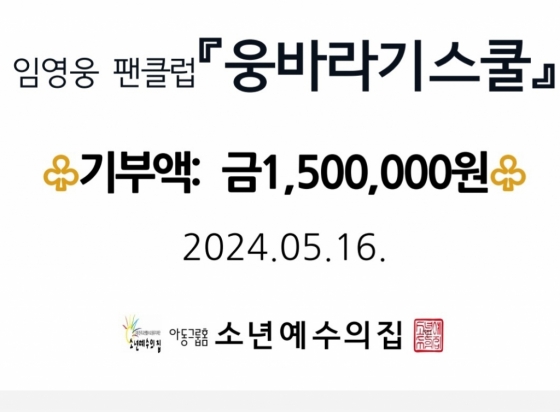 임영웅 팬클럽 '웅바라기스쿨'은 5월 가정의 달을 맞아 50만 원과 150만 원을 서울 송파구 아동그룹홈 '소년예수의집'에 전달했다.