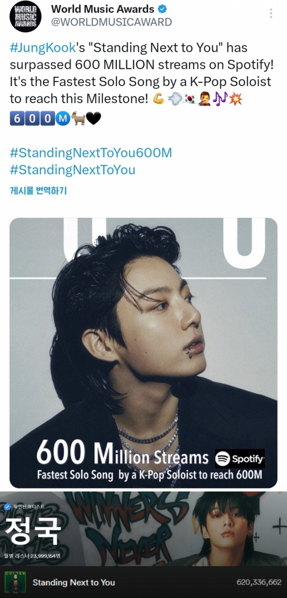 정국이 지난해 11윌 발표한 솔로 앨범 'GOLDEN'(골든) 타이틀곡 'Standing Next to You'(스탠딩 넥스트 투 유)는 최근 세계 최대 음원 스트리밍 플랫폼 스포티파이에서 6억 스트리밍(필터링 전)을 돌파했다.