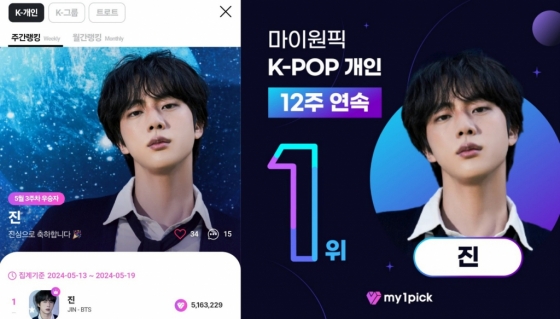방탄소년단(BTS) 진이 마이원픽(MY1PICK) 주간랭킹에서 12주 연속 1위를 차지하며 독보적 인기를 과시했다.