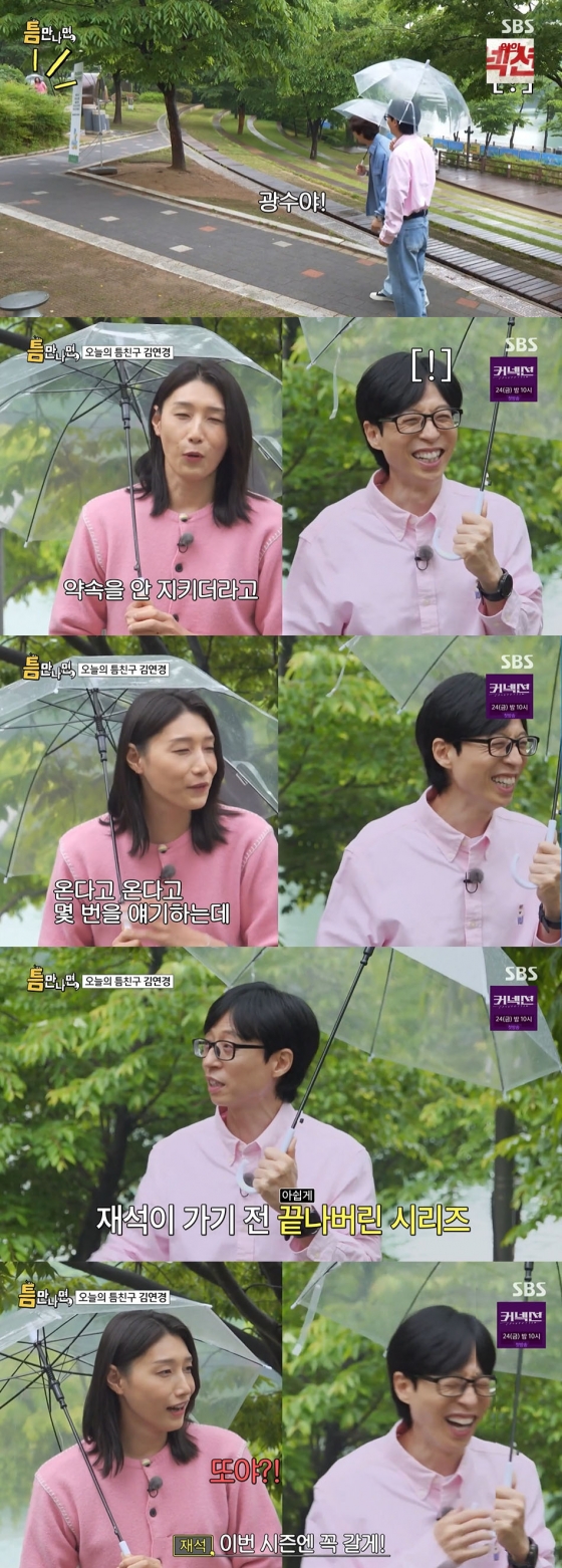 이에 김연경은 "유재석이 응원하러 경기장에 오겠다는 약속을 지키지 않았다"라고 폭로했다. 그는 "약속을 안 지켰다. '온다고, 온다고' 몇 번을 얘기했는데 결국 한 번을 안 왔다. 너무 하더라. 내가 구단에서 큰 소리 많이 냈는데"라며 서운함을 표출, 유재석을 당황케 만들었다.