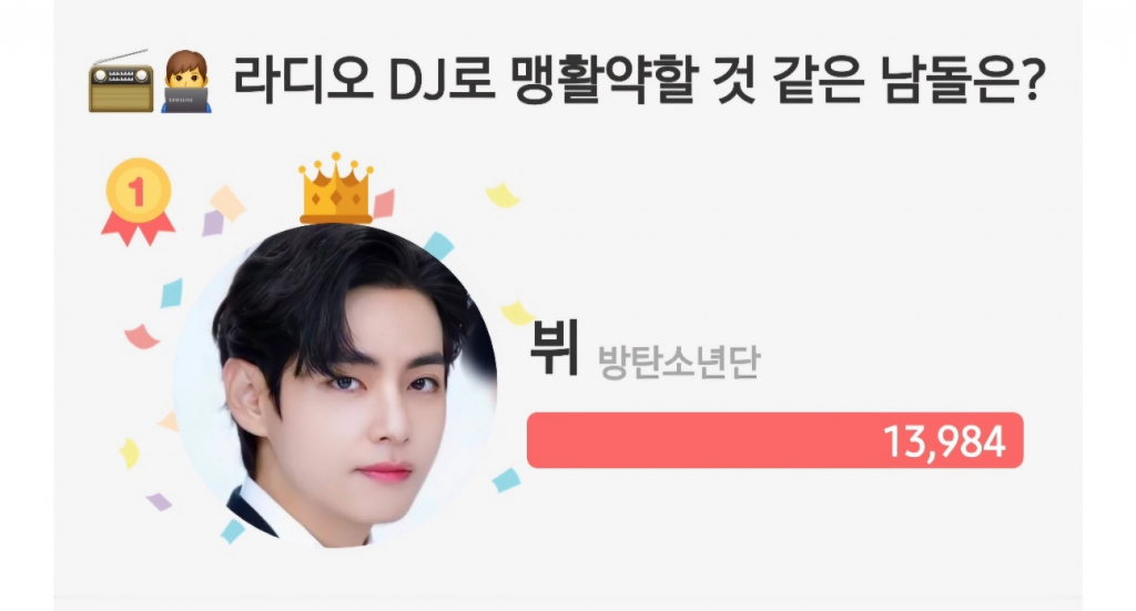 뷔는 5월 15일부터 5월 21일까지 최애돌에서 진행한 '라디오 DJ로 맹활약할 것 같은 남돌은' 설문에서 1위를 차지했다.