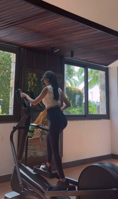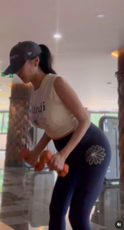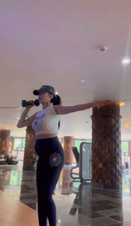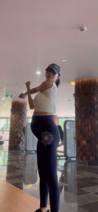 영상에서 김윤지는 만삭 상태로 브라톱과 레깅스를 입고 근력 운동을 하고 있다.