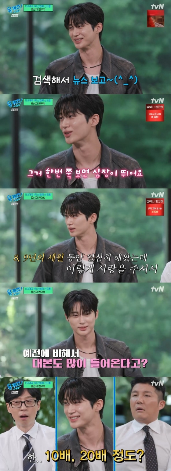 이날 변우석은 '유퀴즈' 출연을 고대했다고 밝혔다. 그는 "기다림보다는 '와 나한테?'라는 생각이 많았다. 항상 ('유퀴즈'를 통해) 배우 선배님들 보고, 귀감이 되는 방송이라 생각했다"며 "('유퀴즈' 출연이) 못 믿을 정도로 좋았다"고 털어놨다.