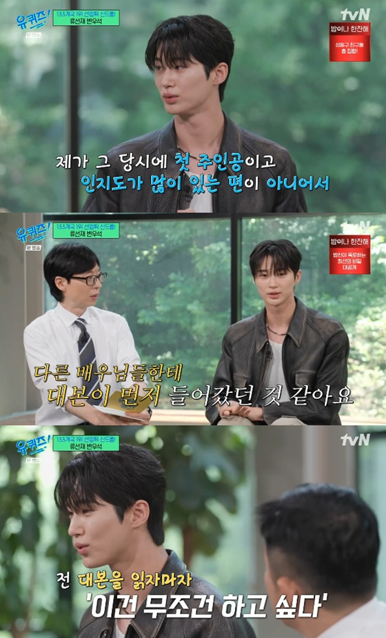 변우석은 '유퀴즈' 출연 소감을 밝혔다. 그는 "기다림보다는 '와 나한테?'라는 생각이 많았다. 항상 ('유퀴즈'를 통해) 배우 선배님들 보고, 귀감이 되는 방송이라 생각했다"며 "('유퀴즈' 출연이) 못 믿을 정도로 좋았다"고 털어놨다.