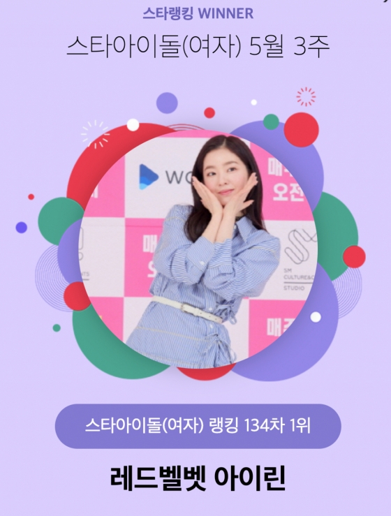 아이린은 지난 16일 오후 3시 1분부터 23일 오후 3시까지 진행된 5월 3주(134차) 스타랭킹 스타아이돌 여자 랭킹 투표에서 3만611표를 얻고 1위를 차지했다.