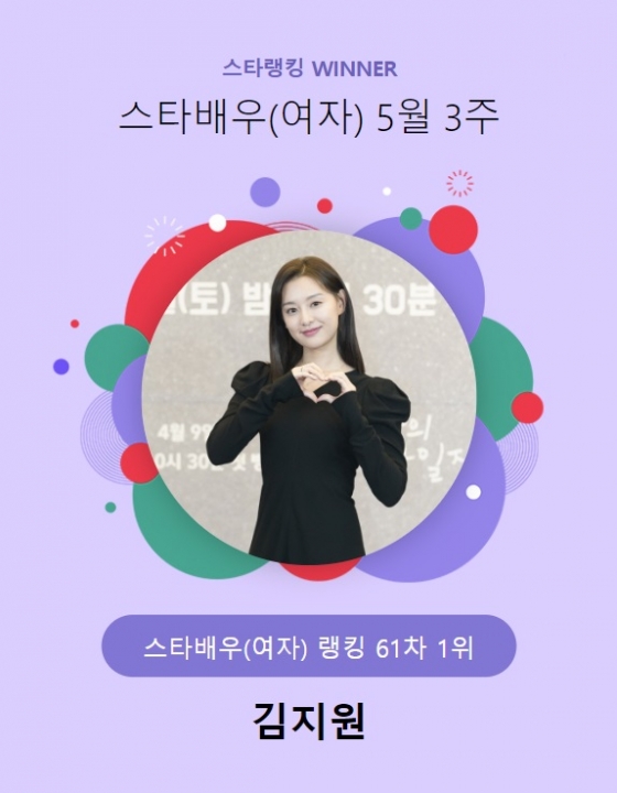 김지원은 지난 16일 오후 3시 1분부터 23일 오후 3시까지 진행된 5월 3주(61차) 스타랭킹 스타배우 여자 랭킹 투표에서 11만 57표를 획득하며 1위를 차지했다.