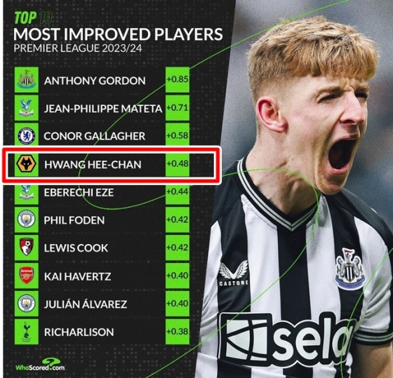 황희찬은 맨체스터 시티의 EPL 4연속 우승을 이끈 6위 필 포든(+0.42점), 9위 훌리안 알바레스(+0.40점), 토트넘의 '1000억 공격수' 히샬리송(+0.38점)보다도 좋은 점수를 기록했다.