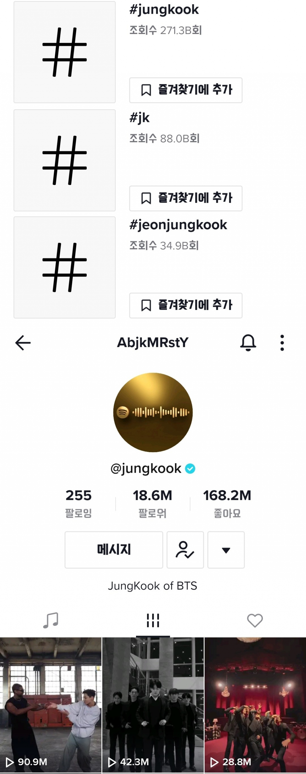 정국은 글로벌 쇼트 비디오 플랫폼 '틱톡'에서 자신의 고유 명사 개인 해시태그 '#jungkook'으로 조회수 2700억을 달성했다.