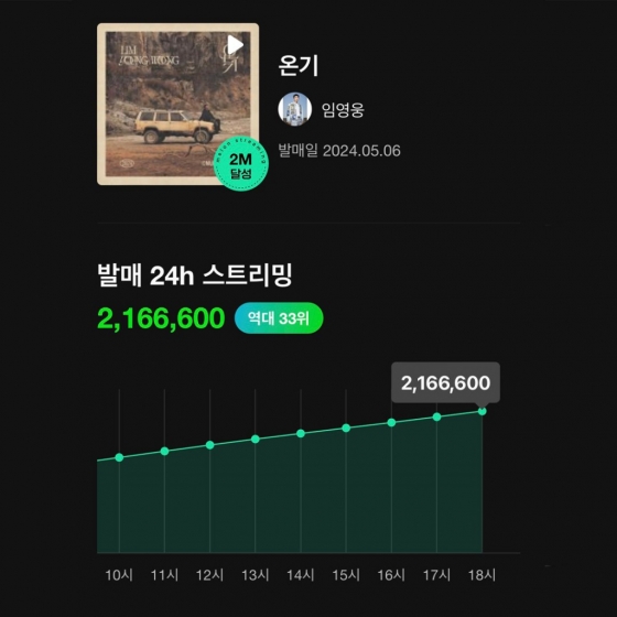 지난 6일 발매, '온기'와 'Home'이 수록된 임영웅 새 앨범 '온기'는 국내 주요 음원 플랫폼 '멜론'에서 발매 24시간 만에 216만 6600 스트리밍을 기록, 멜론의 전당에 올랐다.