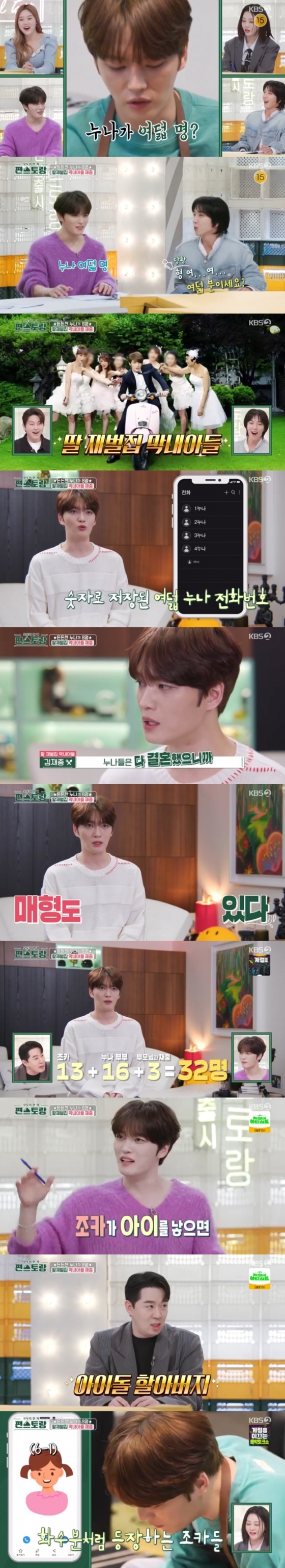 이날 방송에서 김재중은 여덟명의 누나를 공개했다. 그는 "누나만 여덟명이다. 누나들 전화번호가 숫자로 저장되어 있다. 1누나, 2누나, 3누나. 이런 식이다. 실제로 재벌집이다. 딸 재벌집. 매형까지 포함하면 가족 수가 많다"라고 말해 모두를 놀라게 했다.