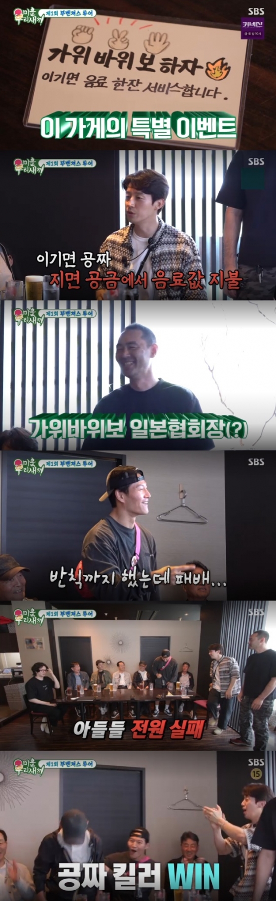 한편 이들이 향한 식당에서는 직원과 가위바위보를 해서 이기면 음료가 공짜인 미션이 있었다. 음료 값을 아낄 수 있다는 사실에 '원조 짠 남자' 김종국 아버지는 여행을 떠난 후 처음으로 함박웃음을 지어 보여 스튜디오를 폭소하게 만들었다. 본격 가위바위보 대결에 나선 '미우새' 부자들은 온갖 필승 전략을 펼치며 손에 땀을 쥐는 경기를 이어갔고 아버지 4명 모두 결국 승리하며 놀라게 했다.
