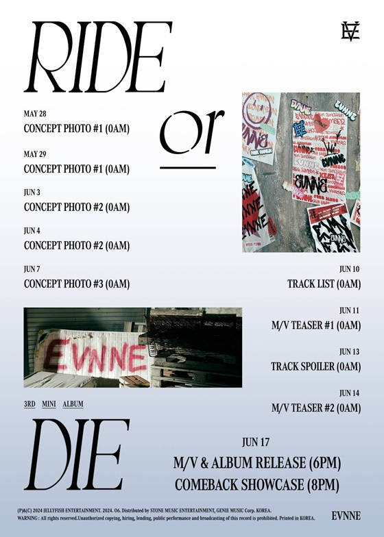 보이 그룹 이븐(EVNNE)이 세 번째 미니 앨범 'RIDE or DIE' 스케줄러를 공개하며 컴백 카운트다운에 돌입했다.