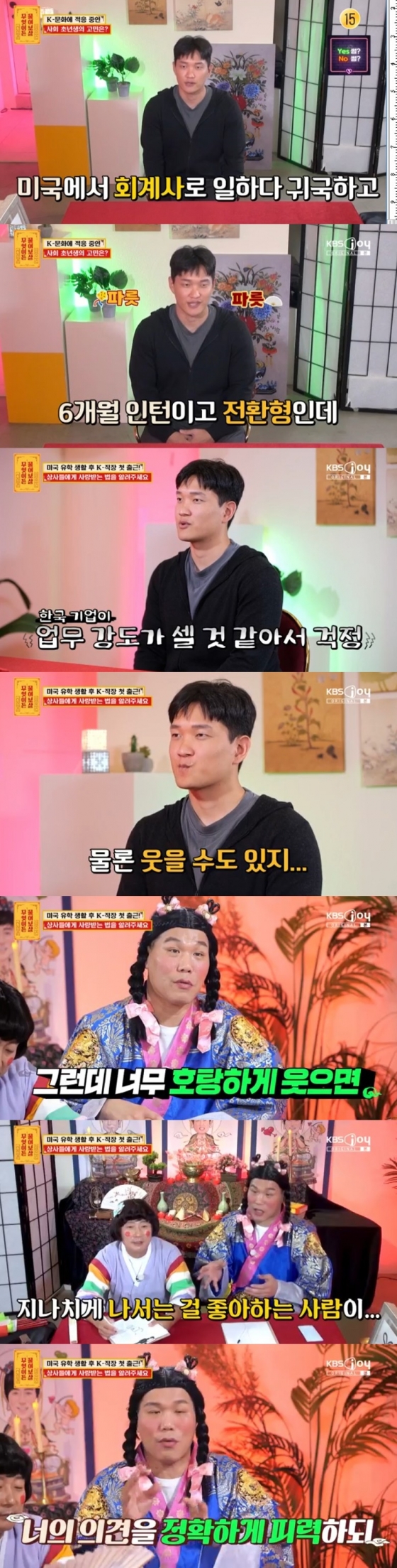 27일 방송된 KBS Joy '무엇이든 물어보살' 268회에서는 미국 회계사에 합격하고 한국에서의 첫 출근을 앞두고 있는 사연자의 이야기가 소개됐다. 그는 "6개월짜리 인턴이고, 전환형이다. 다음주에 출근을 하는데 어떻게 하면 상사에게 예쁨 받을 수 있을지 고민이다"라고 말했다.