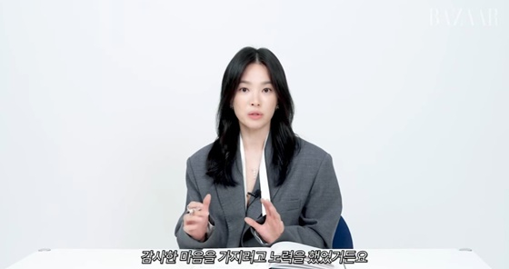 또 송혜교는 "당연시했던 것들에 대해 당연하게 생각하지 않고 감사함을 가지려 노력한다. 아무 일 없이 소소한 하루, 조용한 하루도 감사하다. 이게 작은 게 아니라 큰 거구나, 그런 감사할 줄 아는 마음을 갖게 된 게 요즘 저에게는 장점인 거 같다"라고 전했다.