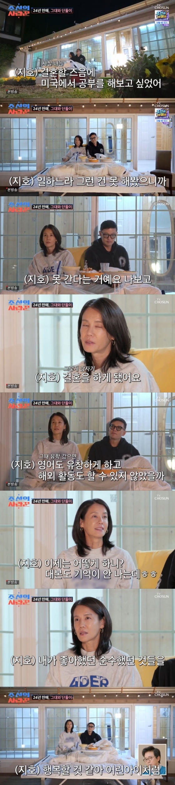 김지호는 "사실 결혼 즈음에 미국으로 유학을 가고 싶었다. 일정을 다 잡아 놓고 오빠를 만나서 유학을 가려고 한다고 말했더니 결혼을 하자고 하더라. (유학) 갔다 와서 하자고 해도, 오빠가 안 된다고 하더라. 그때 내가 유학을 갔으면 영어도 유창하게 하고 해외에서 활동을 할 수도 있지 않았을까 싶다"라고 털어놨다.